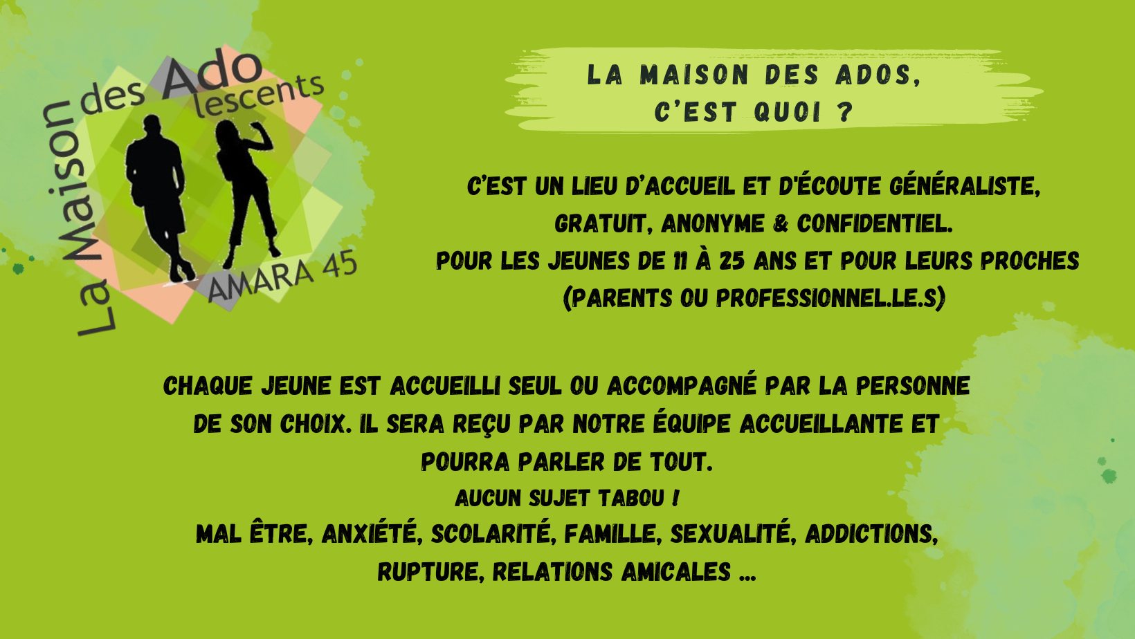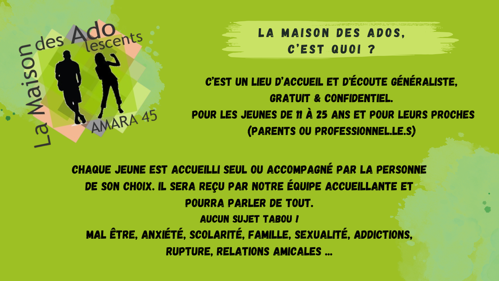 La Maison des Ados est un espace de soutien en santé mentale. Notre préoccupation : que vous alliez bien !