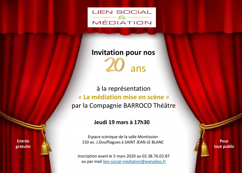 La Compagnie BARROCO Théâtre proposera une représentation spéciale, gratuite et pour tout public, à l’occasion des 20 ans de l’association Lien Social et Médiation, le jeudi 19 mars à 17h30.