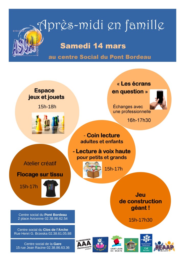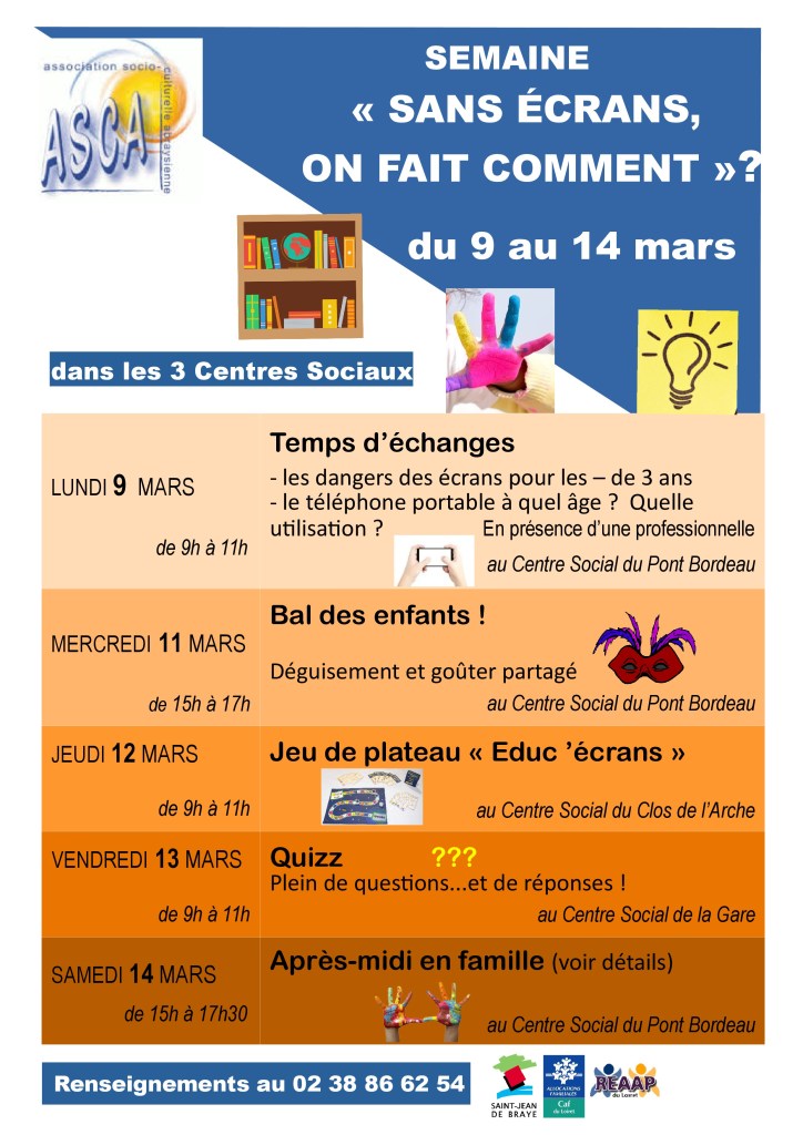 Une semaine d’animation pour s’occuper autrement. Organisée par l’ASCA (Association Socio-Culturelle Abraysienne), dans 3 centres sociaux de la commune de Saint-Jean de Braye. Tout le programme ici. Renseignez-vous!