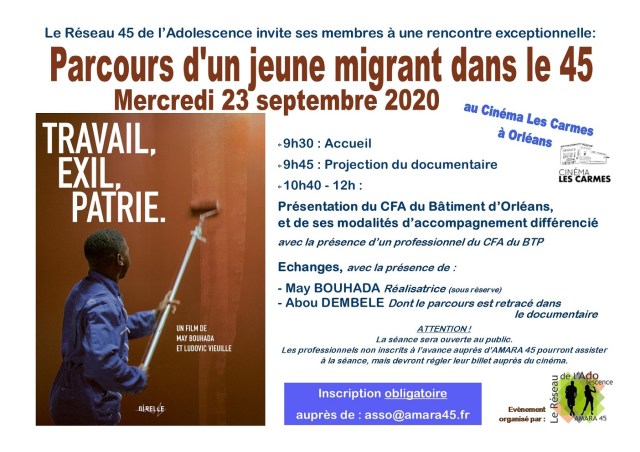 Le mercredi 23 septembre 2020, à 9h30, au cinéma Les Carmes à Orléans, nous invitons les professionnels de l’Adolescence à visionner le documentaire de May Bouhada et Ludovic Vieuille « Travail, Exil, Patrie » et à échanger sur le parcours d’un jeune migrant.