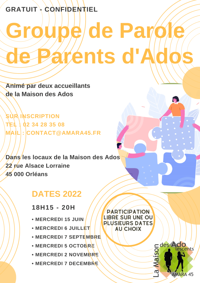 La prochaine date à Orléans est le mercredi 5 octobre 2022, de 18h15 à 20h dans les locaux de la Maison des Ados, 22 rue Alsace Lorraine 45000 Orléans.