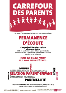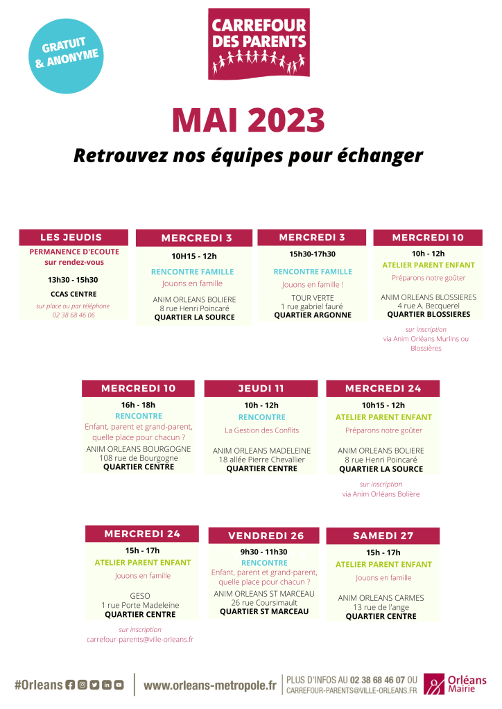 Le Carrefour des Parents est un dispositif gratuit et anonyme ouvert à tous, qui organise chaque mois des échanges autour de la relation parents-enfants dans des différents quartiers d’Orléans.