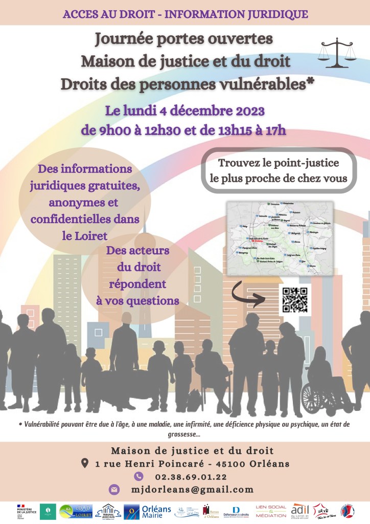 A l’occasion de la Journée internationale des personnes handicapées, la Maison de Justice et du Droit d’Orléans, en partenariat avec le Conseil Départemental d’Accès au Droit du Loiret, organise une journée portes ouvertes sur les droits des personnes vulnérables.