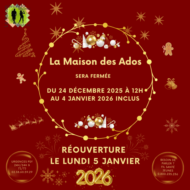 Ă lâoccasion des fĂȘtes de fin dâannĂ©e, nous vous informons que les Maisons des Adolescents de Montargis et d’OrlĂ©ans seront fermĂ©es du Mercredi 24 DĂ©cembre 2025 Ă 12h jusqu’au Dimanche 4 Janvier 2026 inclus.
