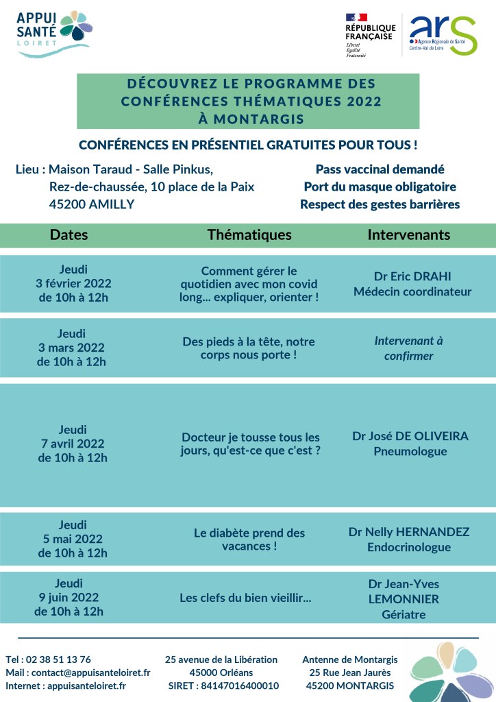 Appui Santé Loiret vous propose 5 conférences sur des thématiques variées liées à la santé.